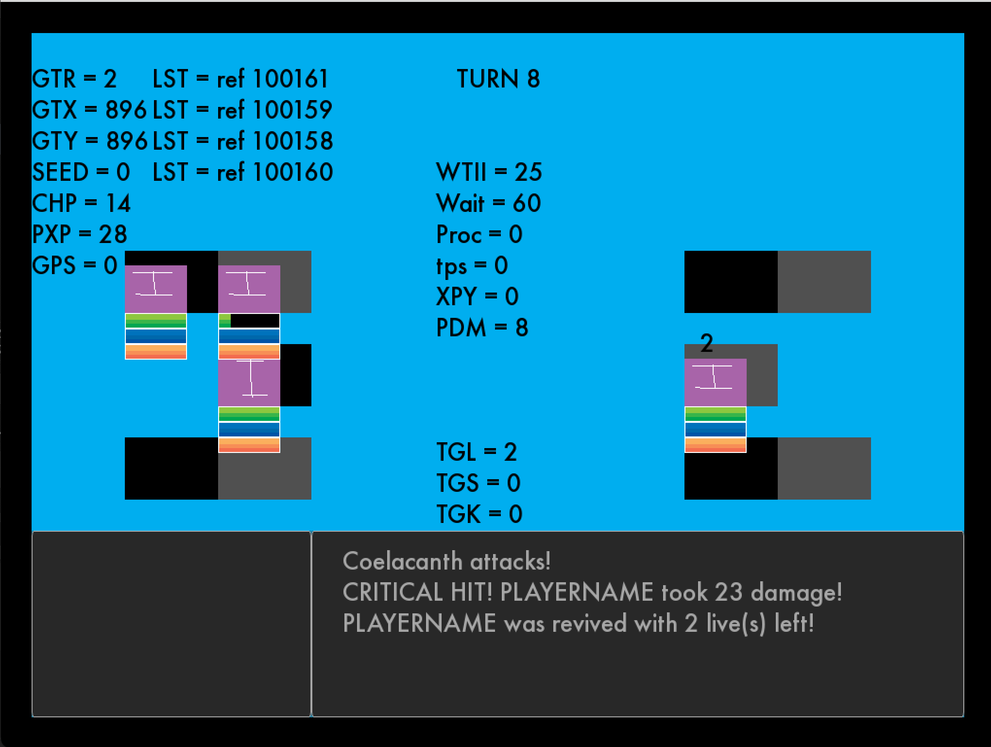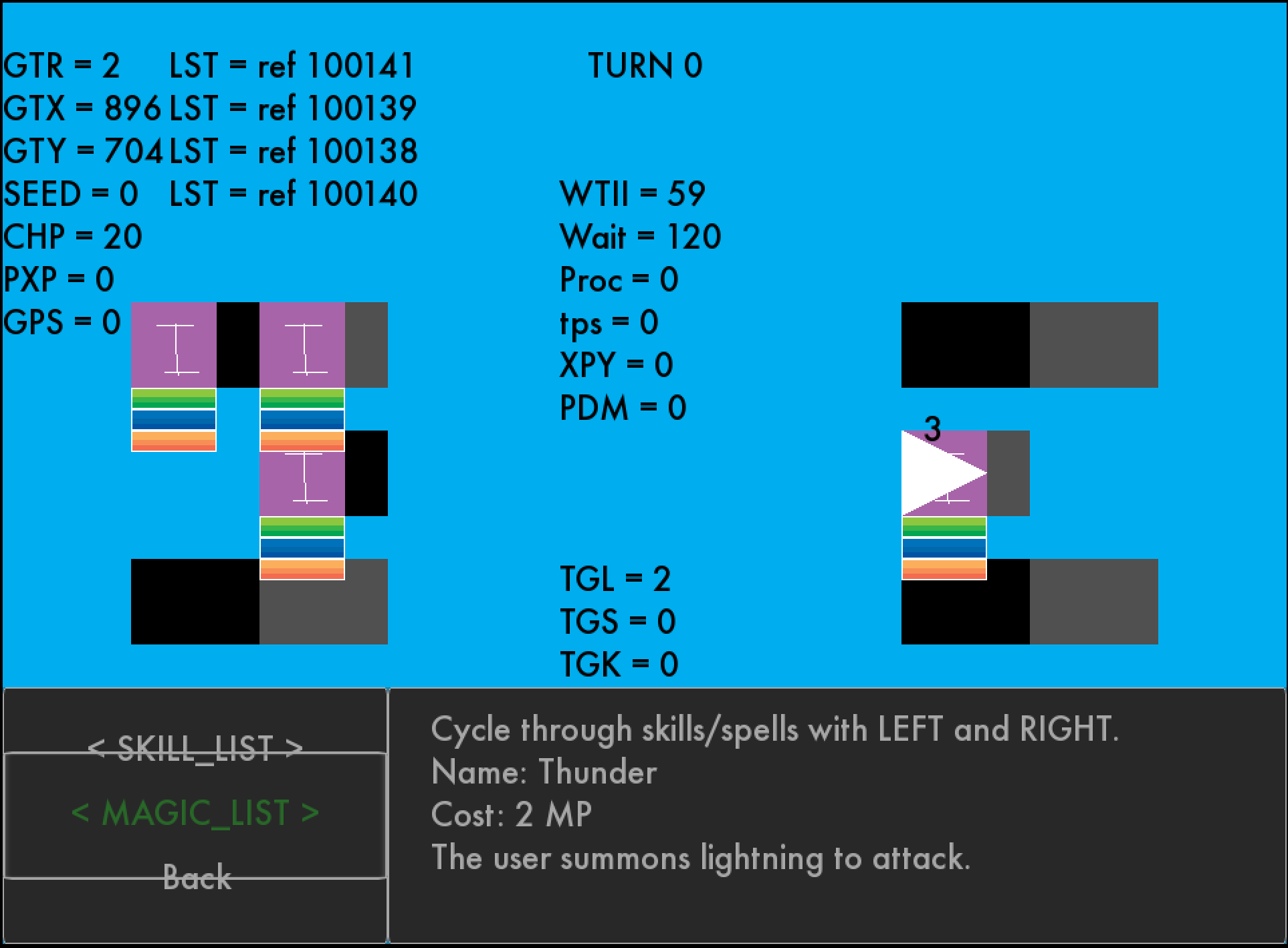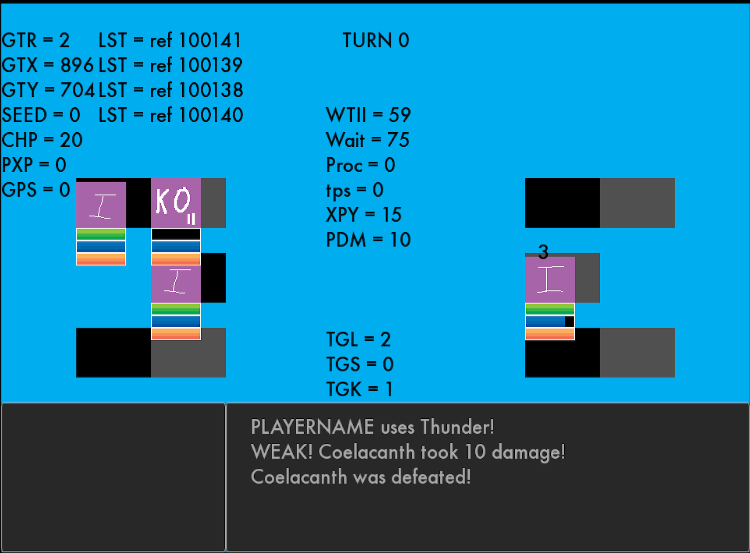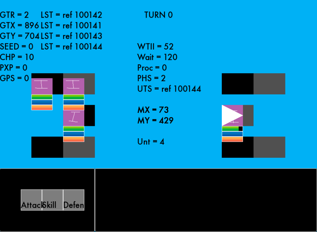 I also developed a fix for a strange bug that prevented turns from progressing properly. From what I can gather, the turn cycle moved so quickly that it kept overwriting actions that units were in the middle of performing––multiple times, this had the result of units “forgetting they were dying” and continuing to fight with 0 HP, never leaving the turn order. My current solution to this is a timer that must run out before the turn-end events can process and which resets at the start of every “unit turn”. 120 in-game ticks is probably a little high, but it’s time enough for all the affected events to play out safely.