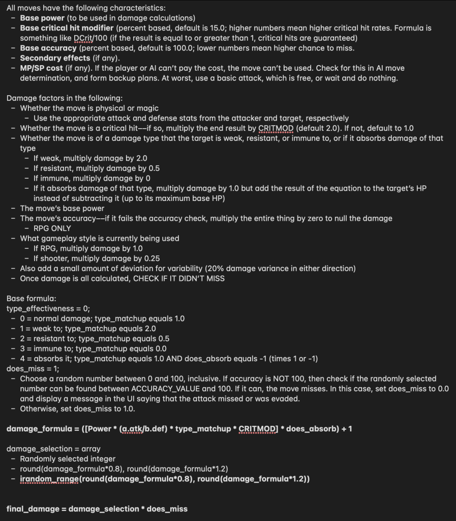 Finally, I devised a damage calculation formula which will eventually be used universally across both gameplay styles. It has not been implemented yet at this time, but for posterity, I have provided my pseudocode notes from this week and last week at the bottom of this entry. Please note that the implementation of this formula is NOT a top priority at this time; I have taken notes on it and hope to add it in if time permits, but for now, my goal remains to have the game in a playable state before I start going for extra style. As stated in class, it is for this very same reason that I am currently holding off on the visual elements like art. My modus operandi for this project is, has been, and will for the foreseeable future remain as follows: I would rather have an ugly game that works correctly than a pretty game that doesn’t do what I want it to.