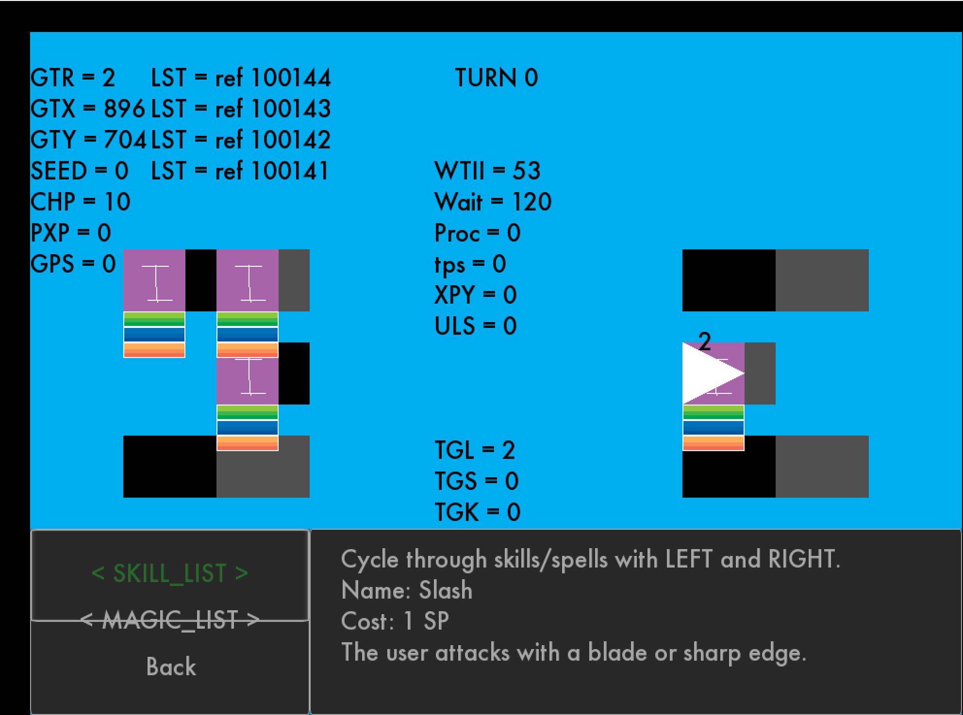 This week, I got skills working…for the player, anyway. I am still working on it for the enemies. The SP cost and most other functions work as intended.