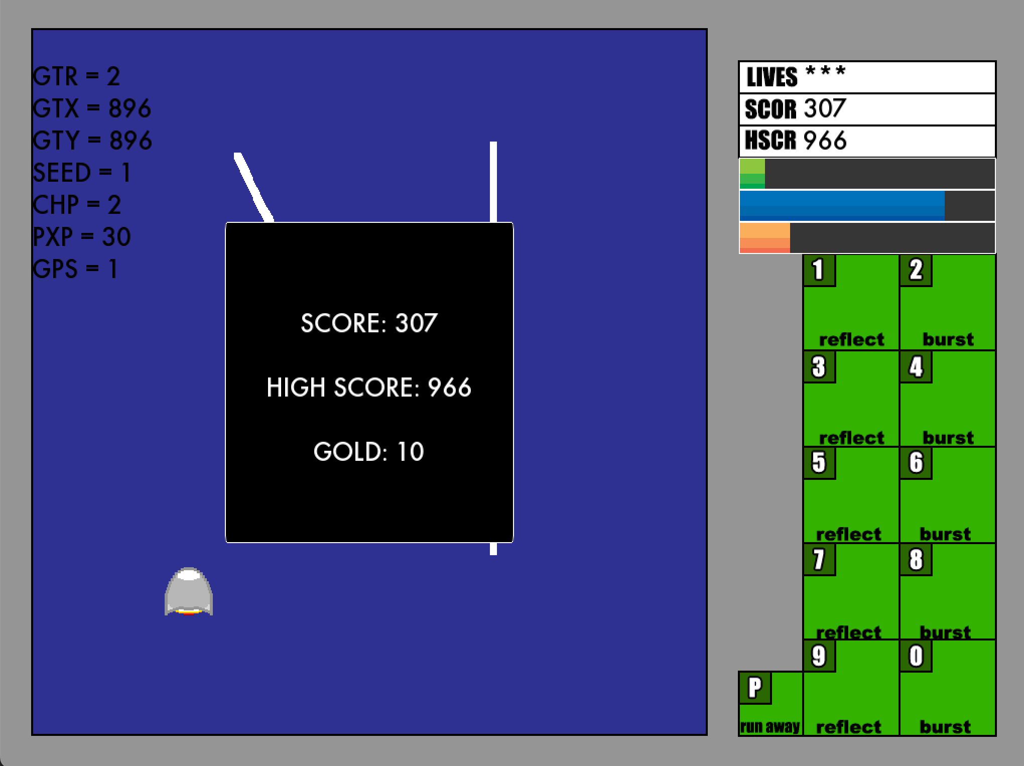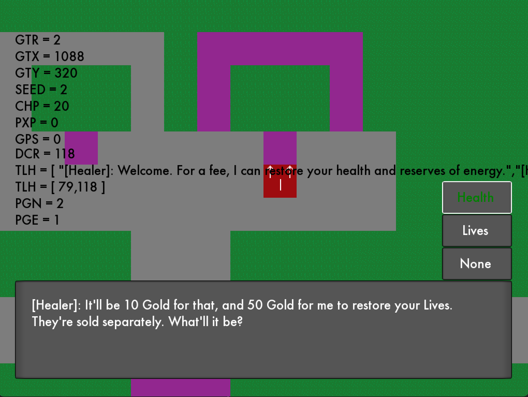 For one thing, a player’s stock of lives has been made relevant to RPG combat, as has EXP gain—though the latter hasn’t done anything of value yet, so I have repurposed it to be a currency to pay for a healer on the overworld. This way, the player can restore lost HP/MP/SP and Lives, whereas before they could not. In addition, the code for calculating damage and processing unit death now checks specifically for if the player unit has reached 0 HP before anything else, then (if so) runs a facsimile of the code used in the shooter section regarding respawning and lives. (On the subject of calculating damage, a small amount of variance has also been introduced to the formula. The damage value is multiplied by 0.5 and 1.5–both rounded to the nearest integer—then those minimum and maximum values are put into a range from which a random integer is selected. If the hit is a critical hit, it instead always takes the maximum value and doubles it.) Finally, I added a few basic sounds to RPG combat to improve game-to-player feedback. Currently they are not custom-made but instead taken from a folder of random sounds I’ve collected over the years, so I will probably swap them for original files later. For now, though, it’s nice to have something there that serves the needed purpose.