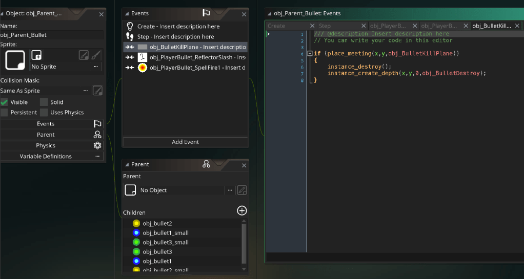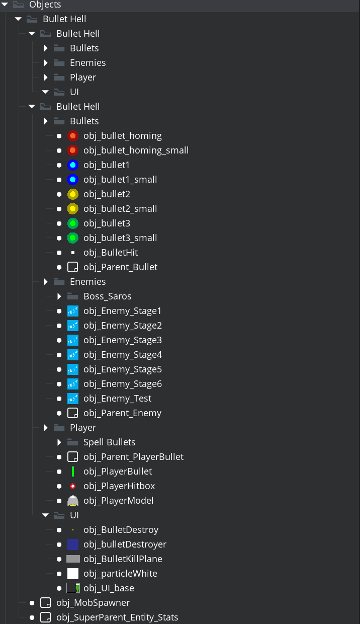 This week, I resorted several objects (bullets, enemies, boss parts) into parent/child objects for ease of classification, and because the disorganization was bothering me. In addition, I introduced a bullet reflection mechanic currently mapped to 1, 3, 5, 7, and 9 (with a 15-second cooldown), and modified the cooldowns of all spells so that there is a 3-second delay before you can use another one, to prevent spamming.