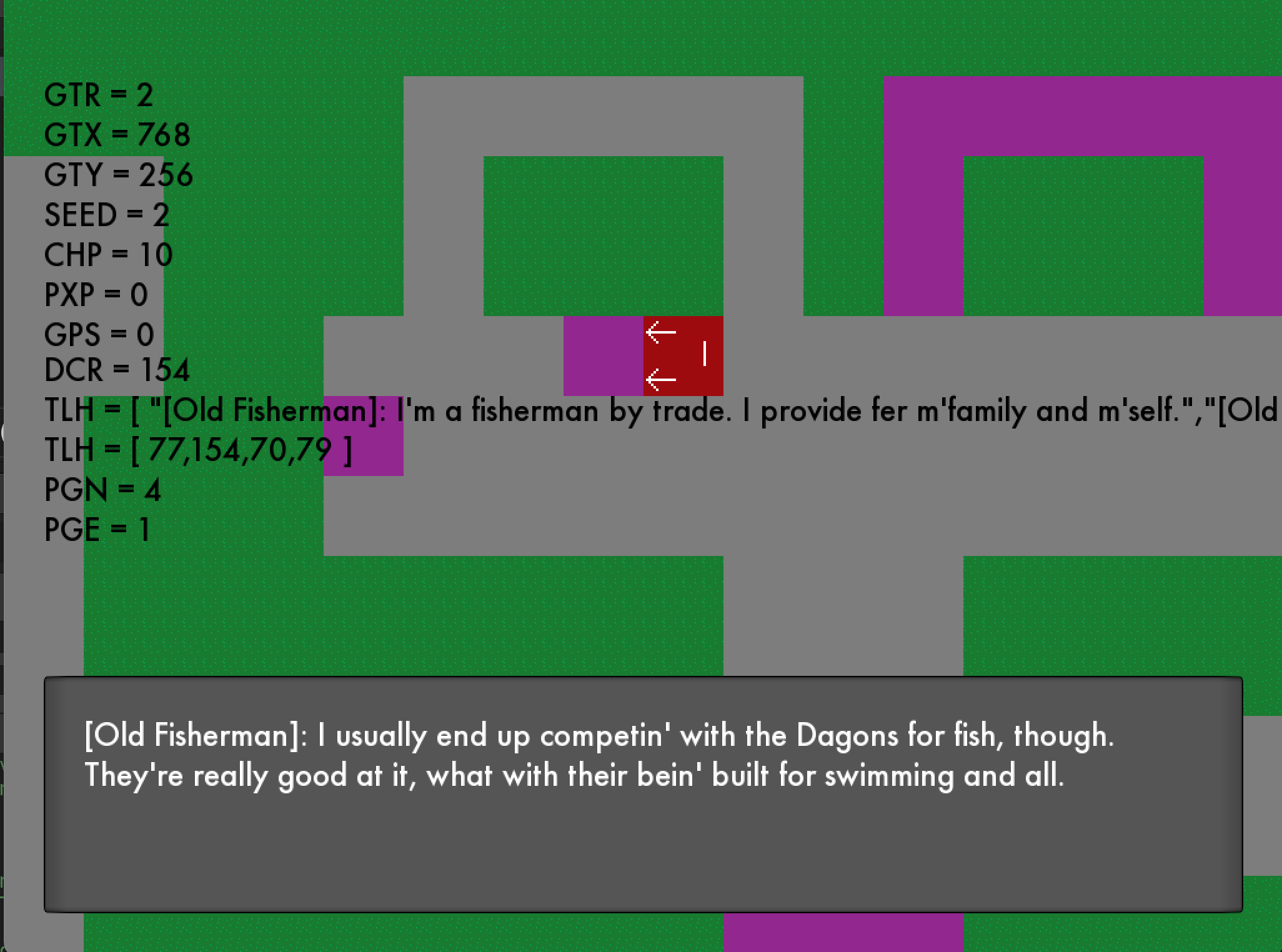 With regard to the player’s movement: I had long entertained the idea of a grid-based game, since having everything on the map be on a consistent grid makes determining collision events with terrain a breeze. After all, when everything is measured in 32×32 boxes, you need only determine which 32×32 boxes the player is allowed to walk on, and just like that, collision is sorted.